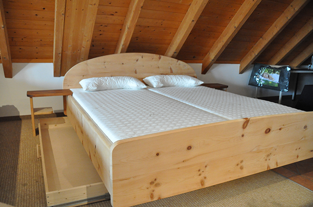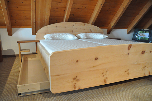 Metallfreies Zirbenholzbett aus eigener Herstellung.